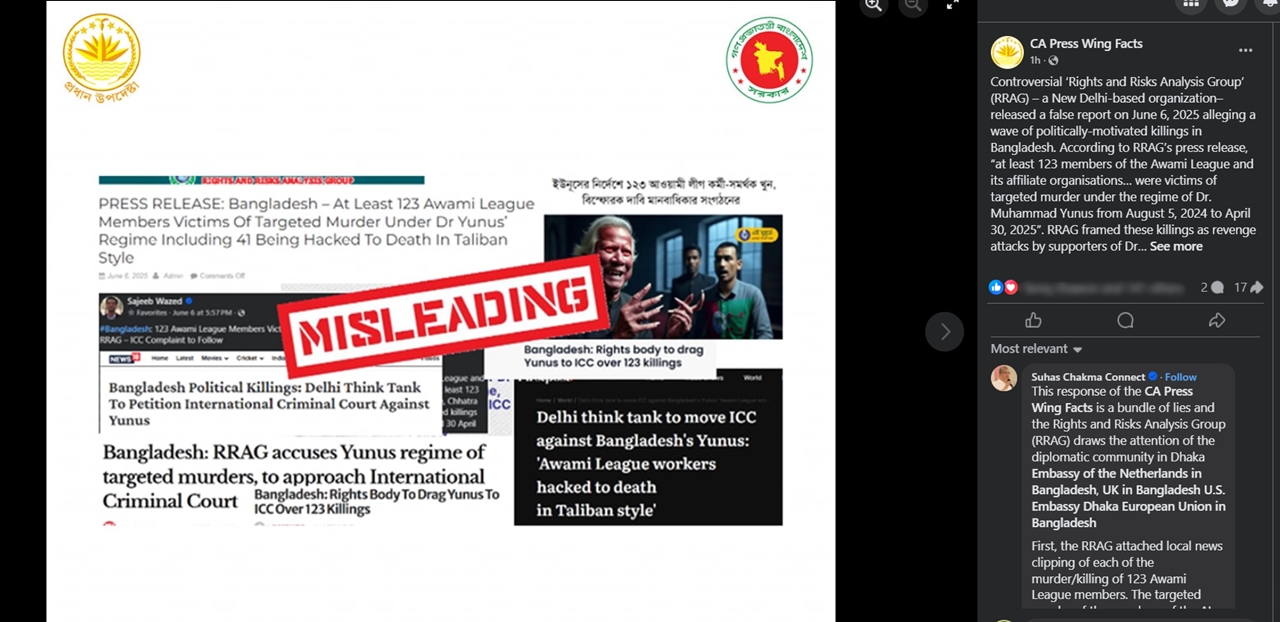 নয়াদিল্লিভিত্তিক সংস্থা ‘রাইটস অ্যান্ড রিস্কস অ্যানালাইসিস গ্রুপ’ (আরআরএজি) কর্তৃক প্রকাশিত প্রেস বিজ্ঞপ্তিতে উল্লিখিত বেশিরভাগ দাবিই বিভ্রান্তিকর এবং বাস্তব তথ্য দ্বারা সমর্থিত নয় বলে দাবি করেছে প্রধান উপদেষ্টার প্রেস উইং ফ্যাক্টস।