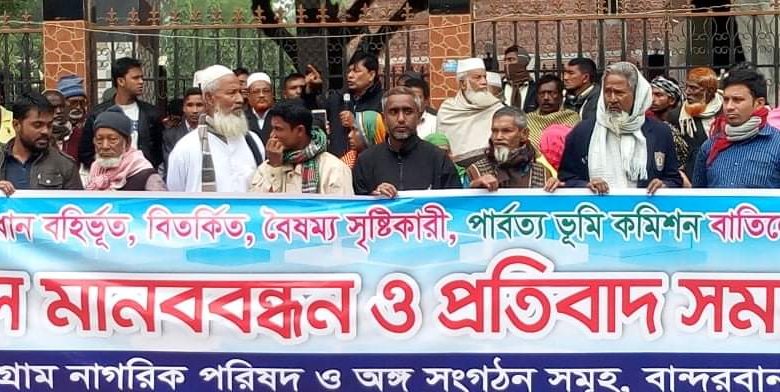 বহুল বিতর্কিত পার্বত্য চট্টগ্রাম ভূমি কমিশন বাতিলের দাবিতে বান্দরবানে মানববন্ধন ও প্রতিবাদ সমাবেশ কর্মসূচী পালন করেছে পার্বত্য চট্টগ্রাম নাগরিক পরিষদ, অঙ্গ ও সহযোগী সংগঠনের নেতা-কর্মীরা। ২১ ডিসেম্বর শনিবার সকালে বান্দরবান প্রেসক্লাবের সামনে এ মানববন্ধন অনুষ্ঠিত হয়।