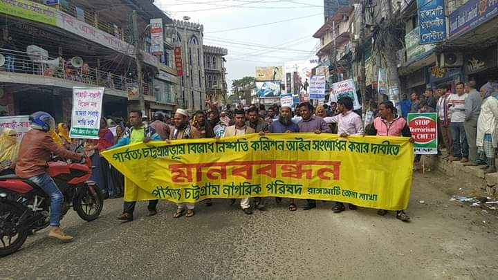 ২১ শনিবার ডিসেম্বর সকালে রাঙ্গামাটি শহরের বনরূপা চত্ত্বরে পার্বত্য চট্টগ্রাম নাগরিক পরিষদ এর উদ্যোগে পার্বত্য চট্টগ্রাম ভূমি বিরোধ নিষ্পত্তি কমিশন আইন সংশোধনের দাবিতে আয়োজিত মানববন্ধনে বক্তারা এসব কথা বলেন।