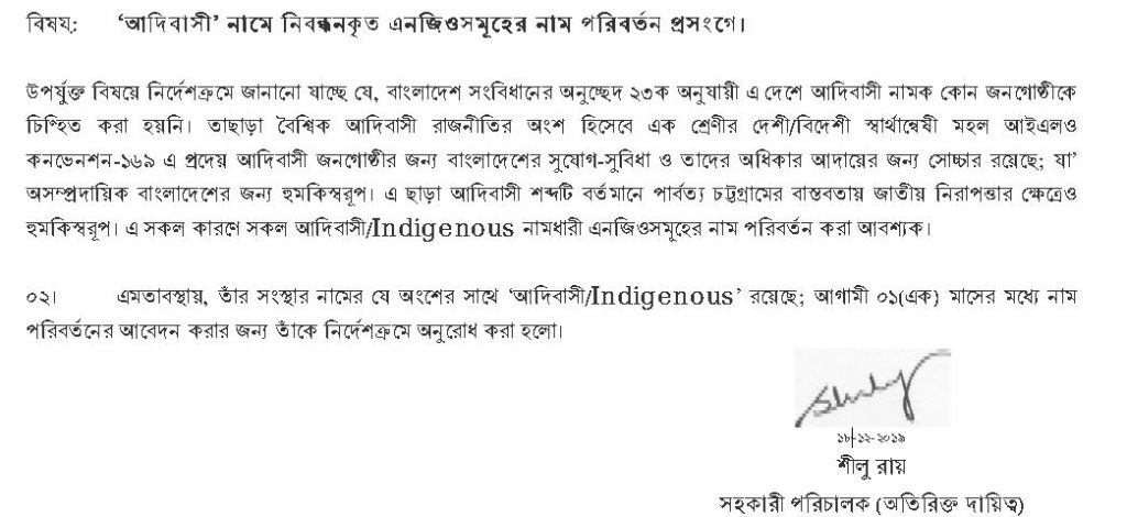 শিলু রায়, সহকারী পরিচালক (অতিরিক্ত দায়িত্ব) স্বাক্ষরিত গত ১৮ ডিসেম্বর তারিখে একটি আদিবাসী এনজিওকে ইস্যুকৃত ওই চিঠিতে আরো বলা হয়েছে, “বাংলাদেশ সংবিধানের অনুচ্ছেদ ২৩ক অনুযায়ী এ দেশে আদিবাসী নামক কোন জনগোষ্ঠীকে চিহ্ণিত করা হয়নি। তাছাড়া বৈশ্বিক আদিবাসী রাজনীতির অংশ হিসেবে এক শ্রেনীর দেশী/বিদেশী স্বার্থান্বেষী মহল আইএলও কনভেনশন -১৬৯ এ প্রদেয় আদিবাসী জনগোষ্ঠীর জন্য বাংলাদেশের সুযোগ সুবিধা ও তাদের অধিকার আদায়ের জন্য সোচ্চার রয়েছে; যা অসাম্প্রদায়িক বাংলাদেশের জন্য হুমকিস্বরূপ। এছাড়া আদিবাসী শব্দটি বর্তমানে পার্বত্য চট্টগ্রামের বাস্তবতায় জাতীয় নিরাপত্তার ক্ষেত্রেও হুমকিস্বরূপ। এ সকল কারণে সকল আদিবাসী/Indigenous নামধারী এনজিওসমূহের নাম পরিবর্তন করা আবশ্যক। এমতাবস্থায় আগামী এক মাসের মধ্যে নাম পরিবর্তনের আবেদন করার জন্য নির্দেশক্রমে অনুরোধ করা হলো।”