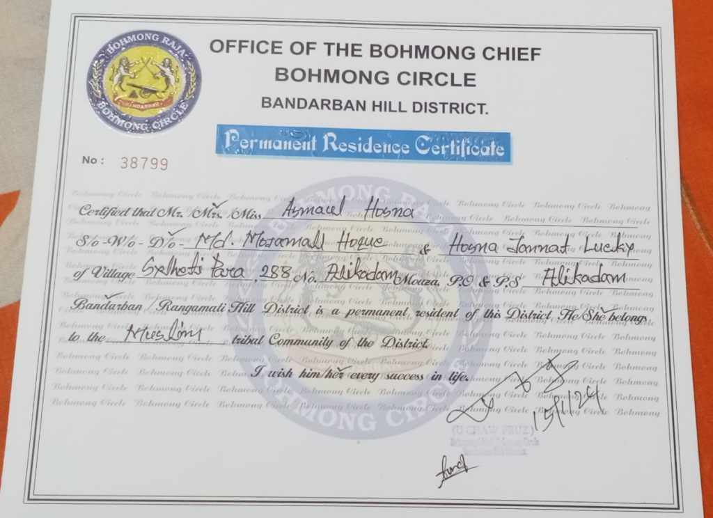 ২০২৪ সালে চট্টগ্রাম বিশ্ববিদ্যালয়ে ভর্তি হওয়ার সময় তিনি পার্বত্য কোটা সুবিধা ভোগের লক্ষ্যে বোমাং সার্কেল চীফ কার্যালয় থেকে অনেক কাঠখড় পুড়িয়ে একটি স্থানী বাসিন্দা সনদ সংগ্রহ করেন। সেই সনদ পেতে তাঁকে গুনতে হয়েছে ১৬ হাজার টাকা—যা ছিল তার পরিবারের জন্য এক বিশাল চাপ। অথচ বাস্তবে দেখা গেল, ওই সনদ কোনো কাজে আসেনি। কারণ, কোটা সুবিধা পাওয়ার জন্য বাধ্যতামূলক শর্ত হিসেবে জেলা প্রশাসকের প্রদত্ত স্থায়ী বাসিন্দা সনদ প্রয়োজন।