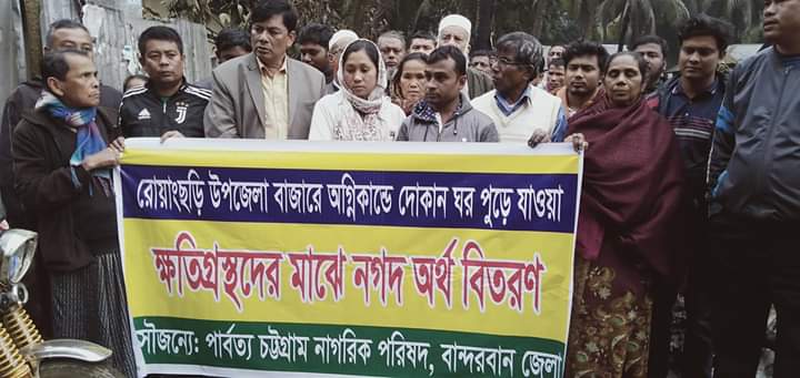 বান্দরবান পার্বত্য জেলার রোয়াংছড়ি বাজারে অগ্নিকান্ডে ক্ষতিগ্রস্তদের মাঝে সহায়তা প্রদান করেছে পার্বত্য চট্টগ্রাম নাগরিক পরিষদ। ২৯ জানুয়ারী বুধবার দুপুরে পার্বত্য চট্টগ্রাম নাগরিক পরিষদের নেতৃবৃন্দ ক্ষতিগ্রস্তদের হাতে নগদ সহায়তা তুলে দেন।