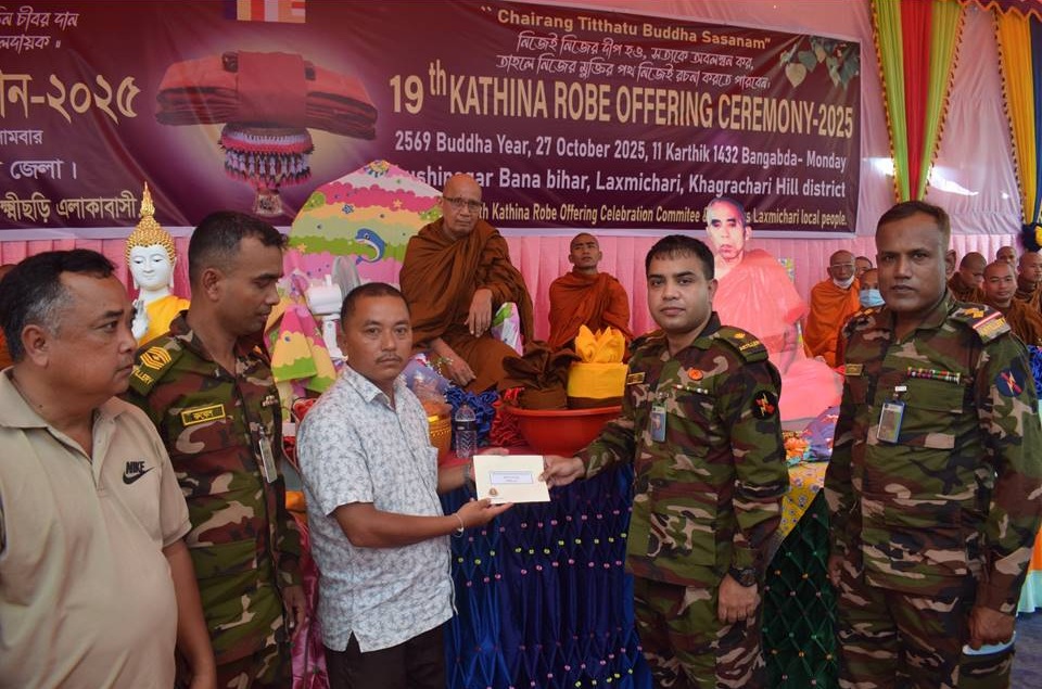 কঠিন চীবর দান উৎসব ২০২৫ উপলক্ষে খাগড়াছড়ি পার্বত্য জেলার লক্ষীছড়ি উপজেলার কুশি নগর বন বিহারে আর্থিক সহযোগিতা ও উপহার সামগ্রী প্রদান করেছে বাংলাদেশ সেনাবাহিনী।