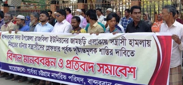 বান্দরবান সদর উপজেলার জামছড়ি এলাকায় গত ২২ ফেব্রুয়ারি শনিবার উপজাতি সন্ত্রাসীদের গুলিতে দুইজন নিহতের ঘটনায় মানববন্ধন করেছে পার্বত্য চট্টগ্রাম নাগরিক পরিষদ। ২৪ ফেব্রুয়ারি সোমবার সকালে বান্দরবান প্রেসক্লাবের সামনে এই মানববন্ধন কর্মসূচি অনুষ্ঠিত হয়।