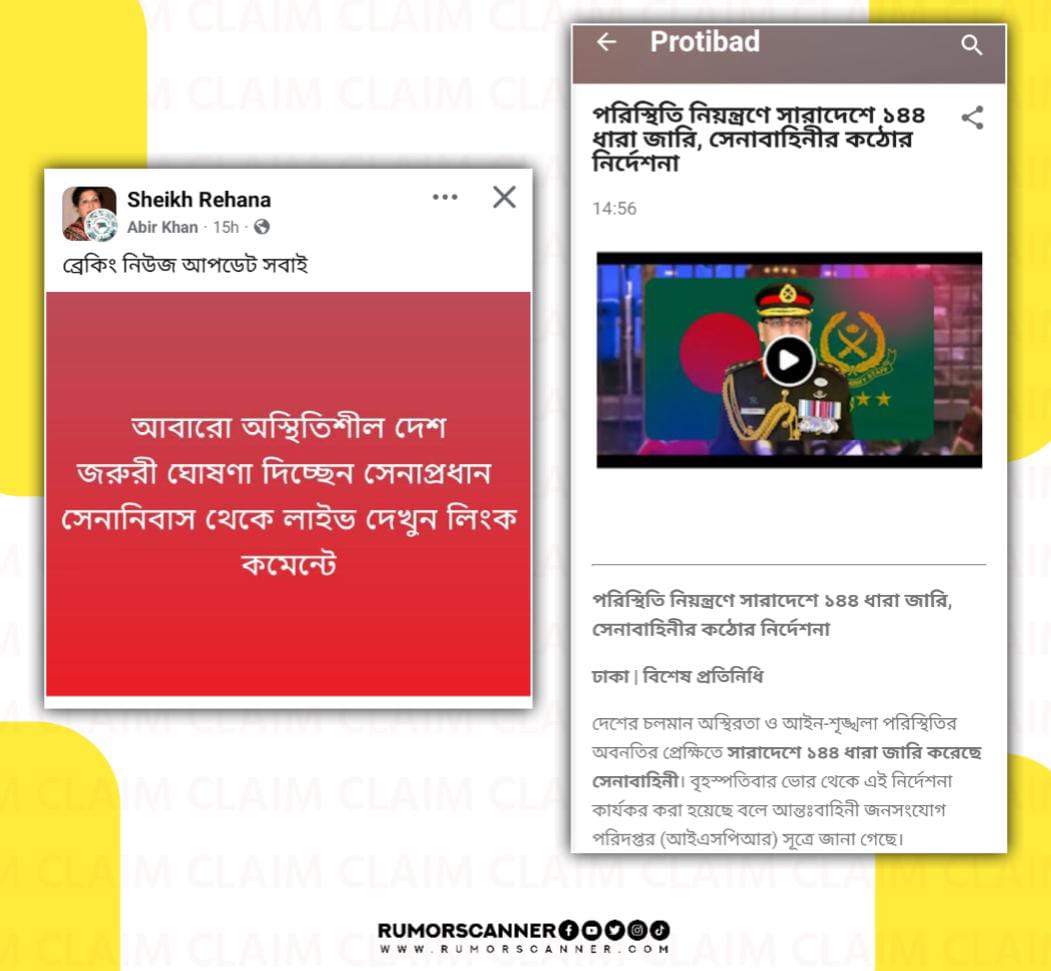 অন্তত গত ২০ ডিসেম্বর রাত থেকে সামাজিক যোগাযোগ মাধ্যমে দাবি প্রচার করা হয়েছে, ‘আবারো অস্থিতিশীল দেশ জরুরী ঘোষণা দিচ্ছেন সেনাপ্রধান সেনানিবাস থেকে’। বিস্তারিত দাবিতে একটি লিঙ্ক পোস্টের মন্তব্য সেকশনে সংযুক্ত করা হয় যেখানে দাবি করা হয়, ‘দেশের চলমান অস্থিরতা ও আইন-শৃঙ্খলা পরিস্থিতির অবনতির প্রেক্ষিতে সারাদেশে ১৪৪ ধারা জারি করেছে সেনাবাহিনী। বৃহস্পতিবার ভোর থেকে এই নির্দেশনা কার্যকর করা হয়েছে বলে আন্তঃবাহিনী জনসংযোগ পরিদপ্তর (আইএসপিআর) সূত্রে জানা গেছে।’