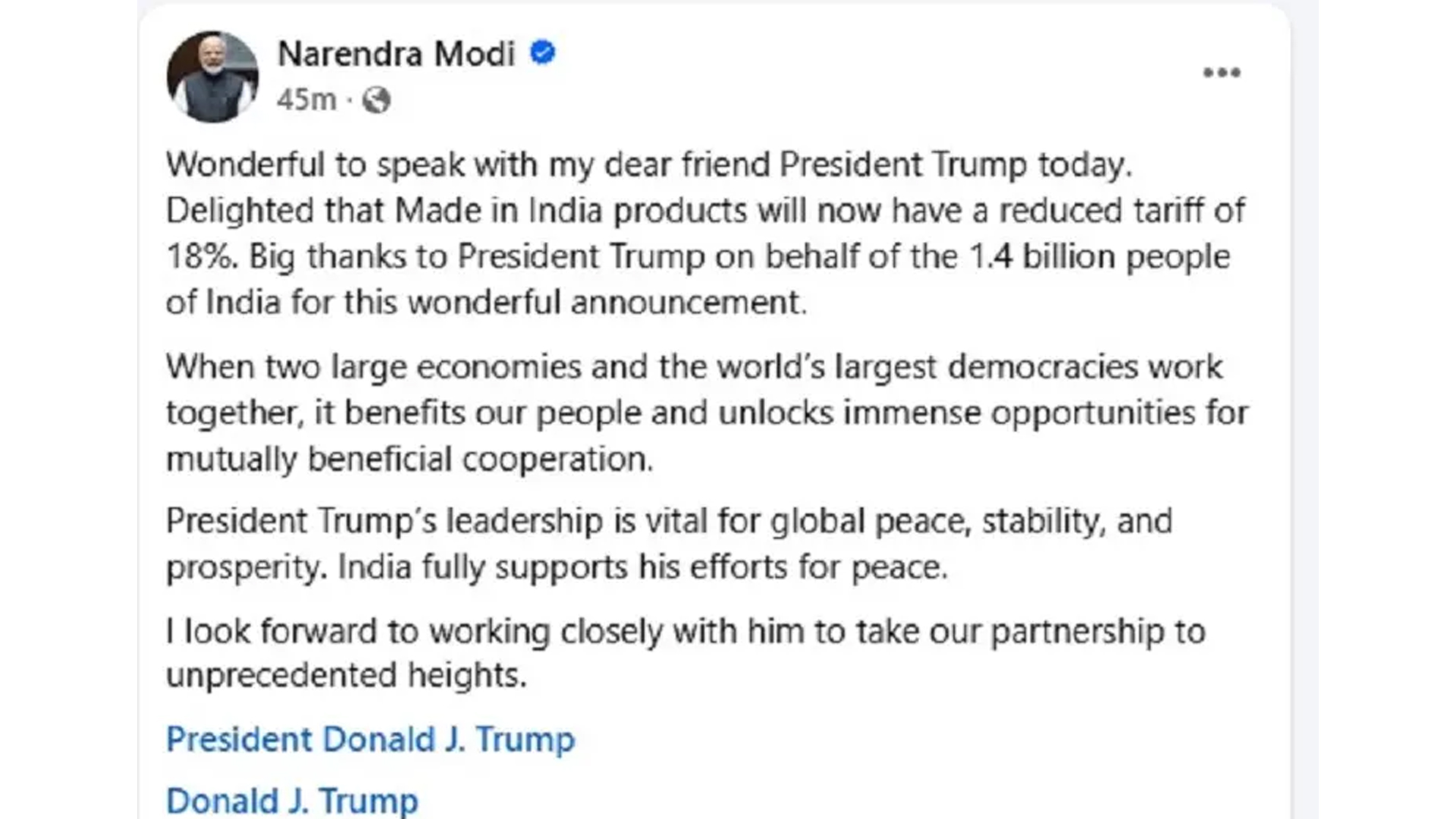 মোদি আরও উল্লেখ করেন, বিশ্বের দুটি বৃহৎ অর্থনীতি ও বৃহত্তম গণতন্ত্র যখন একসঙ্গে কাজ করে, তখন সাধারণ মানুষই উপকৃত হয়। তিনি ট্রাম্পের নেতৃত্বকে বিশ্বশান্তি ও স্থিতিশীলতার জন্য গুরুত্বপূর্ণ বলে অভিহিত করেন।