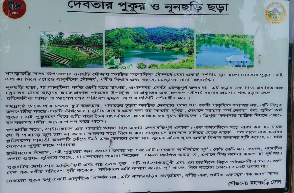 সেনাবাহিনীর স্থাপন করা বিলবোর্ডে ‘দেবতা পুকুর ও নুনছড়ি ছড়া’ শিরোনামে স্থানটির প্রাকৃতিক সৌন্দর্য, ঐতিহাসিক পটভূমি, ধর্মীয় গুরুত্ব এবং স্থানীয় কিংবদন্তিগুলো সংক্ষিপ্ত অথচ চমৎকার ভাষায় তুলে ধরা হয়েছে। এতে উল্লেখ করা হয়, আলুটিলা পর্বতশ্রেণী থেকে উৎপন্ন নুনছড়ি ছড়ার স্বচ্ছ জলধারা ও বিশাল পাথরের সমন্বয়ে গড়ে উঠেছে এক মনোরম প্রাকৃতিক পরিবেশ, যা দর্শনার্থীদের মুগ্ধ করে।