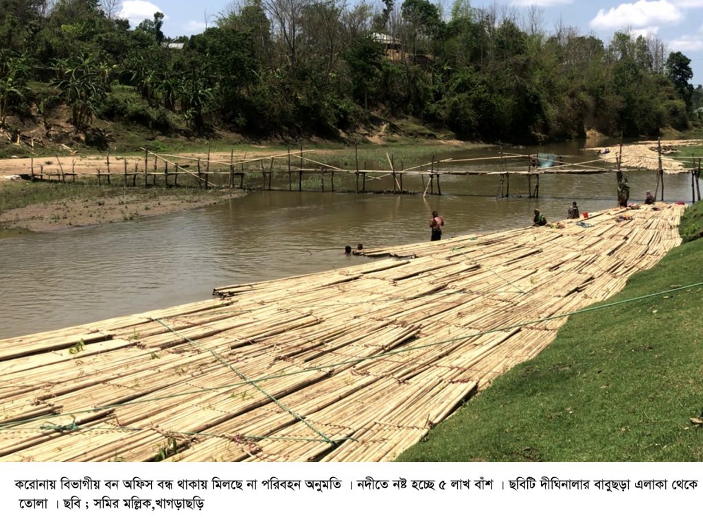 করোনা ভাইরাসের কারণে খাগড়াছড়িতে কোটি টাকার লোকসানের মুখে পড়েছিলো বাঁশ ব্যবসায়ীরা। বিভাগীয় বন অফিস বন্ধ থাকায় মিলছিলো না বাঁশ পরিবহনের অনুমতি। এতে দুই কোটি টাকা লোকসানের মুখে ব্যবসায়ীরা। খাগড়াছড়ির দীঘিনালায় বাবুছড়ায় দেশের অন্যতম বৃহৎ বাঁশের বাজার। বাবুছড়া বাজার সংলগ্ন ৪টি ঘাট থেকে প্রতিদিন অন্তত ২৪টি বাঁশ বোঝায় ট্রাক দেশের বিভিন্ন অঞ্চলে যাতায়াত। রাঙামাটি উত্তর বন বিভাগের আওতাধীন নাড়াইছড়ি রেঞ্জ থেকে স্থানীয়দের মাধ্যমে এসব কিনে নিয়ে আসে ব্যবসায়ী। প্রতিটি বাঁশ বাবদ ১ টাকা ৭০ পয়সা রাজস্ব হিসেবে বন বিভাগে জমা দেয় ব্যবসায়ীরা।। বাঁশ বিপণন থেকে সরকার প্রতি বছর লক্ষ লক্ষ টাকা রাজস্ব পেয়ে থাকে।