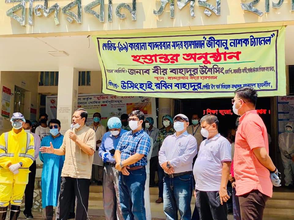 বান্দরবান সদর হাসপাতালে জীবাণুনাশক ২টি টানেলের উদ্বোধন করেছেন পার্বত্য চট্টগ্রাম বিষয়ক মন্ত্রনালয়ের মন্ত্রী বীর বাহাদুর উশৈসিং।